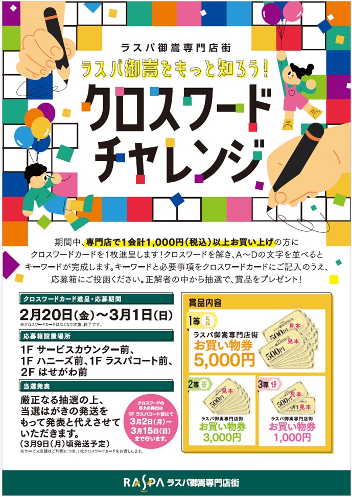 | 場所 | 応募箱設置場所/1Fサービスカウンター前、1Fラスパコート前、1Fハニーズ前、2Fはせがわ前 |
