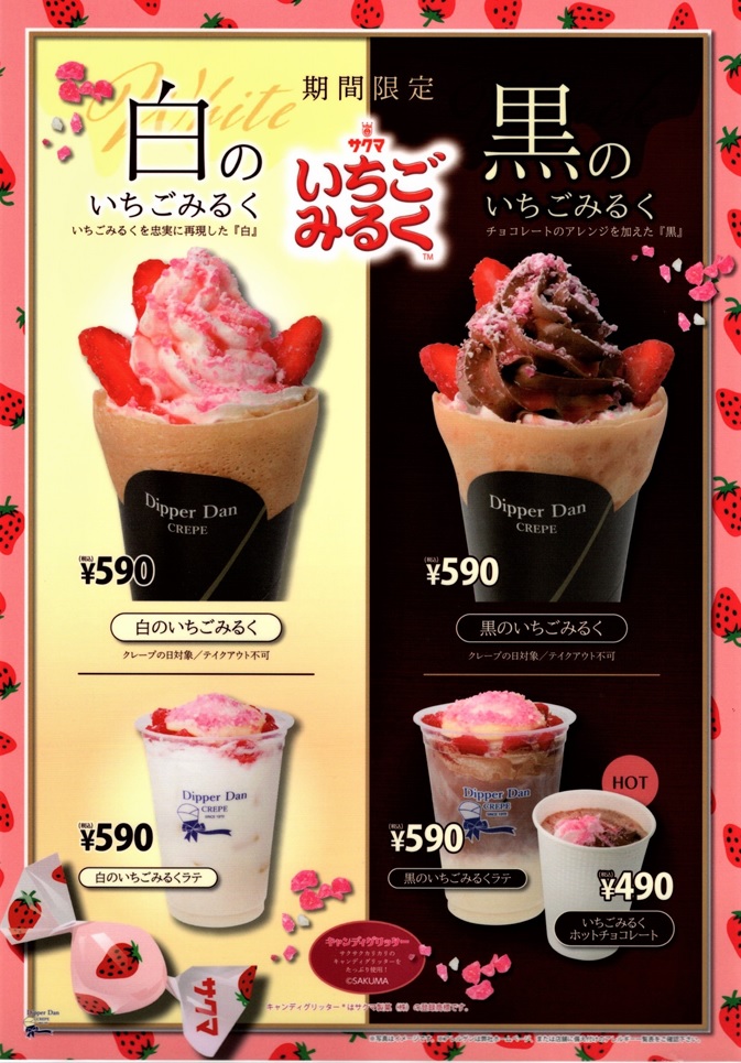 ”白と黒”の2種類のときめきを贅沢にお楽しみいただける、サクマ製菓「いちごみるく」とディッパーダンのスペシャルなコラボ限定メニュー🍓 この機会に是非、お楽しみください♪